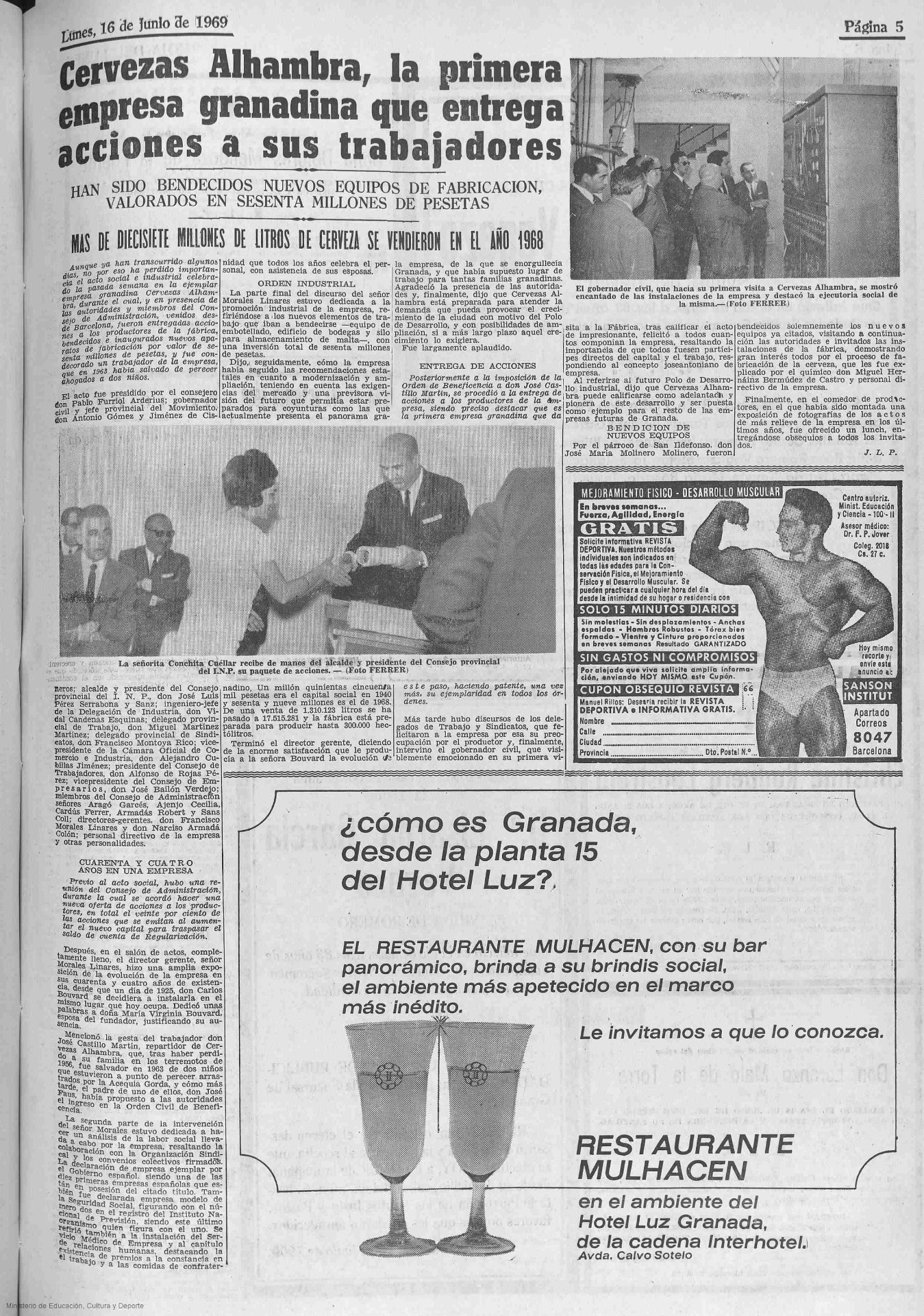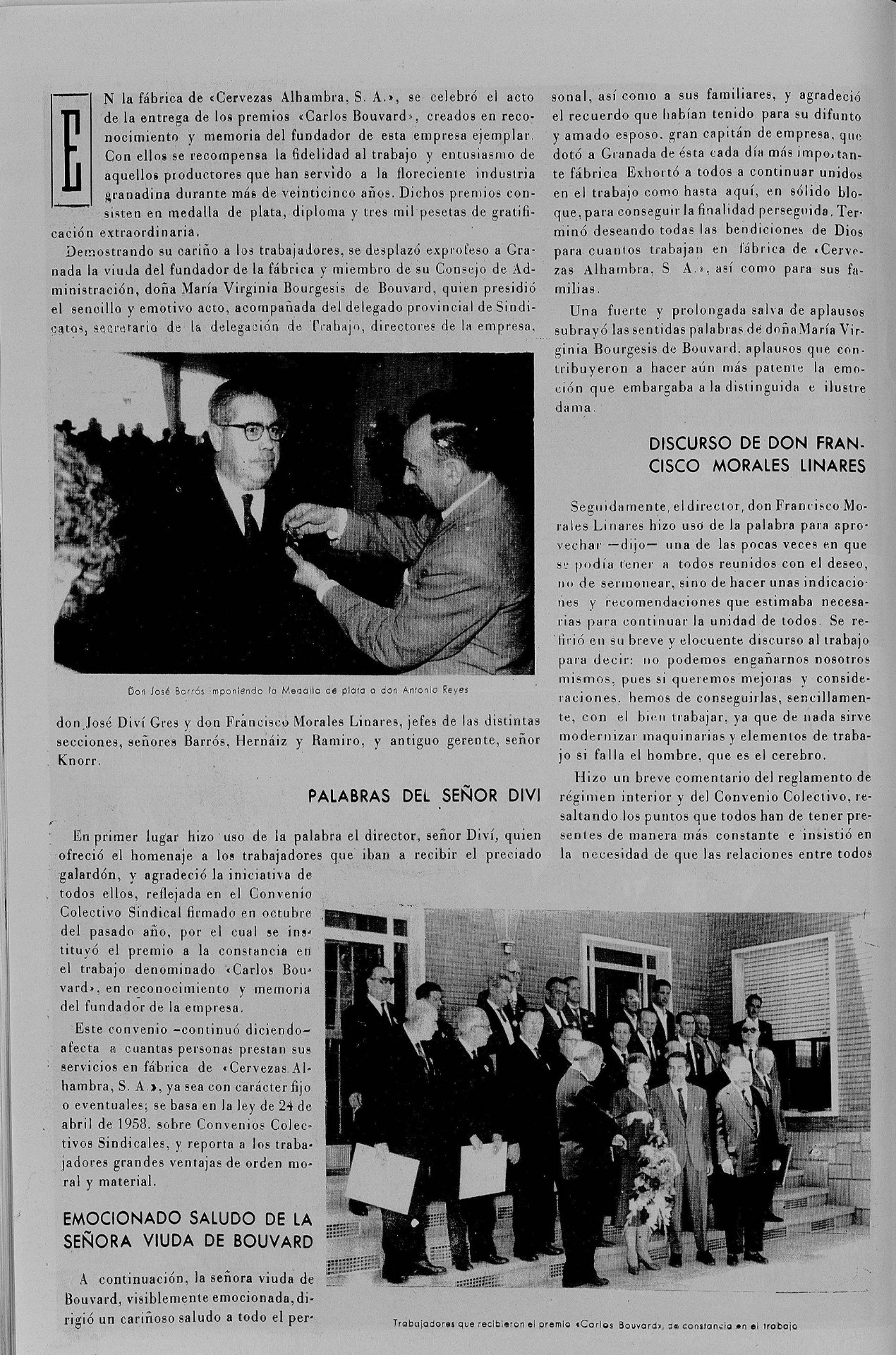 Articulo revista grafica y fotos de la entrega de premios cedidas por hijas del director comercial de Cervezas Alhambra por mas de 30 años Don Jose Casares. En las fotos aparecen Madame Bouvard , director de la fábrica Francisco Morales, entre otros.